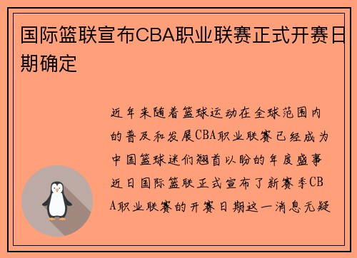 近年来,随着篮球运动在全球范围内的普及和发展,CBA职业联赛已经成为中国篮球迷们翘首以盼的年度盛事。近日,国际篮联正式宣布了新赛季CBA职业联赛的开赛日期,这一消息无疑为篮球爱好者们带来了巨大的喜悦和期待。